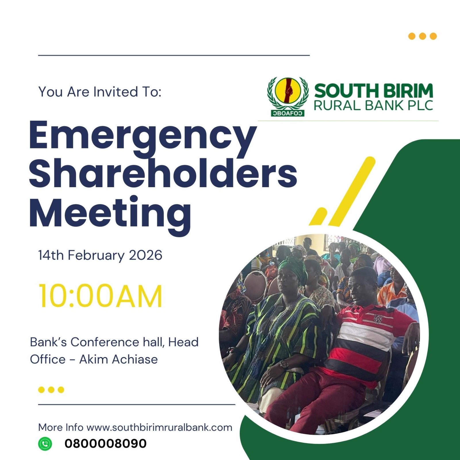 Notice is hereby given that an Emergency General Meeting of the shareholders will be held at the Osabarima Darko Frempong II Conference Hall of South Birim Rural Bank PLC, Akim Achiase on Saturday, 14th February, 2026, at 10:00 a.m prompt.